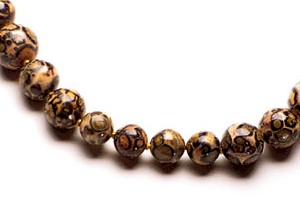In the highest quality therapeutic Leopardskin Jasper, a necklace's spheres display many black and gray circles on a rich golden background. These circles are well defined and contrast sharply with the background color. This golden background can have a range of other tones, including tan, yellow, orange, red, and brown. In low-quality Leopardskin Jasper, fewer circles are apparent; also, the background color lacks a golden quality and looks dull and washed out.